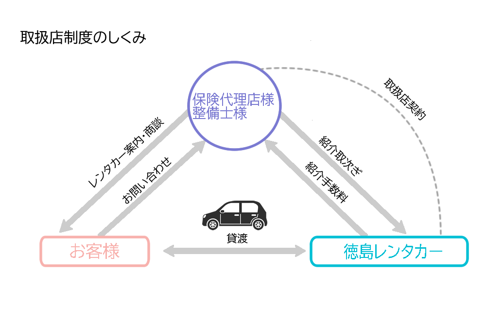 レンタカー紹介店制度とは、提携先様より取次ぎいただいた情報をもとに、弊社がお客様との商談・契約などすべての業務を行い、ご利用金額に応じて紹介手数料をお支払いする制度です。